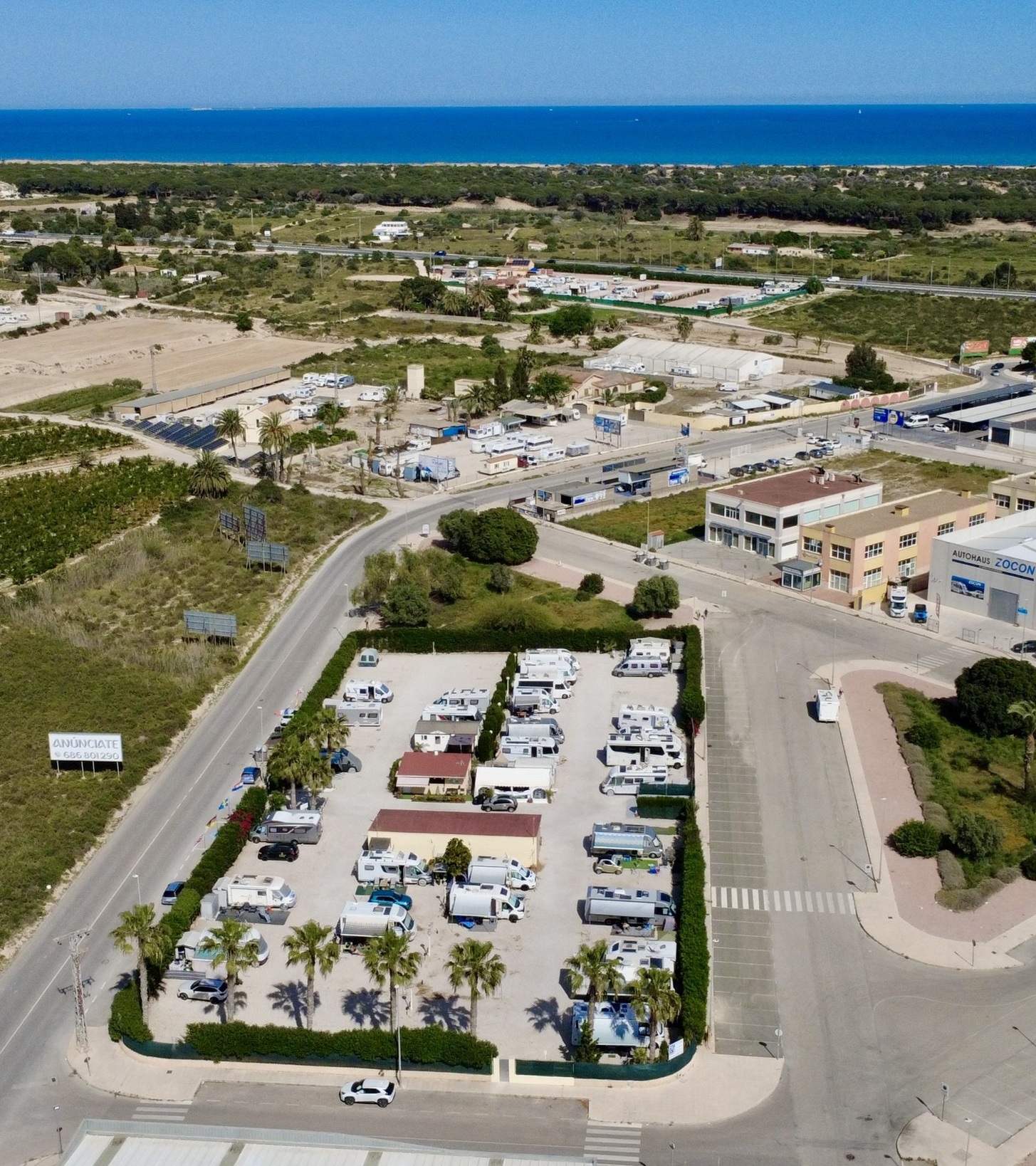 Der Platz liegt verkehrsgünstig an der N-332, ideal als Zwischenstopp auf einer Tour entlang der Costa Blanca. Das Meer ist nur 2 km entfernt und in ca. 20 Minuten zu Fuß erreichbar.